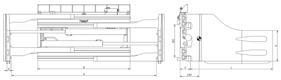 | typ | udźwig kg/mm LC | sugerowany udźwig kg/mm LC | ISO | B mm | zakres otwarcia A wewn. mm | wysokość H mm | długość L mm | S* (max.) mm | V mm | ESP mm | waga kg |