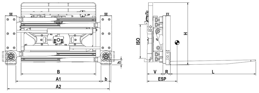 typ udźwig na widłach kg/mm LC udźwig jako chwytak kg/mm LC sugerowany udźwig kg/mm LC ISO B mm A1 mm A2 mm widły b x h x L mm R mm V mm ESP mm waga kg