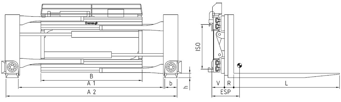 | Typ | Udźwig na widłach kg/mm LC | Udźwig jako chwytak kg/mm LC | Sugerowany udźwig kg/mm LC | ISO | B mm | A1 mm | A2 mm | Widły b x h x L mm | R mm | V mm | ESP mm | Waga kg |