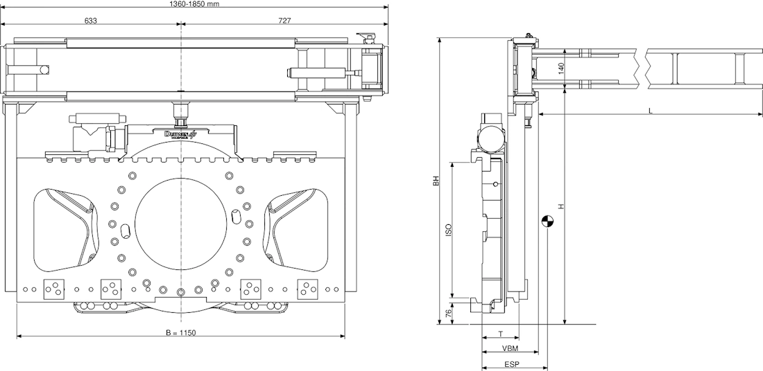 | typ | udźwig kg/mm LC | sugerowany udźwig kg/mm LC | ISO | szerokość B mm | ramię h x t x L mm | moment obrotowy ΔP 130 bar | łączna wysokość* mm | szer. pojemnika mm | T mm | V mm | ESP mm | waga kg |