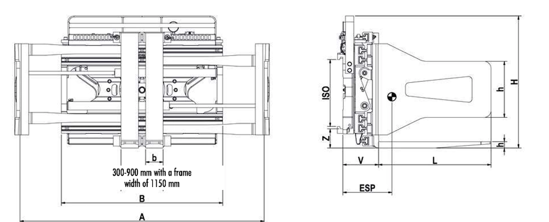 | typ | udźwig kg/mm LC | sugerowany udźwig kg/mm LC | ISO | B mm | zakres otwarcia A ITI mm | widły b x h mm | ramiona L x H mm | Z mm | V LLC mm | ESP mm | waga kg |