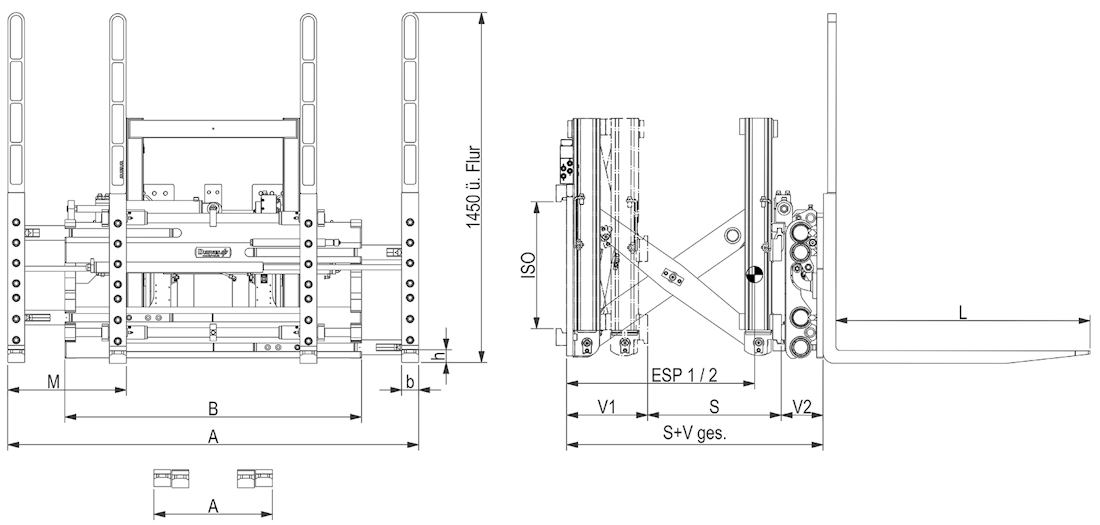 | Typ | Udźwig kg/mm LC | Sugerowany udźwig kg/mm LC | ISO | B mm | A mm | M/N mm | Widły b x h x L mm | Wysuw S mm | Przesuw mm | V1+V2 LLC mm | ESP I COG I mm | ESP II COG II mm | Waga kg |