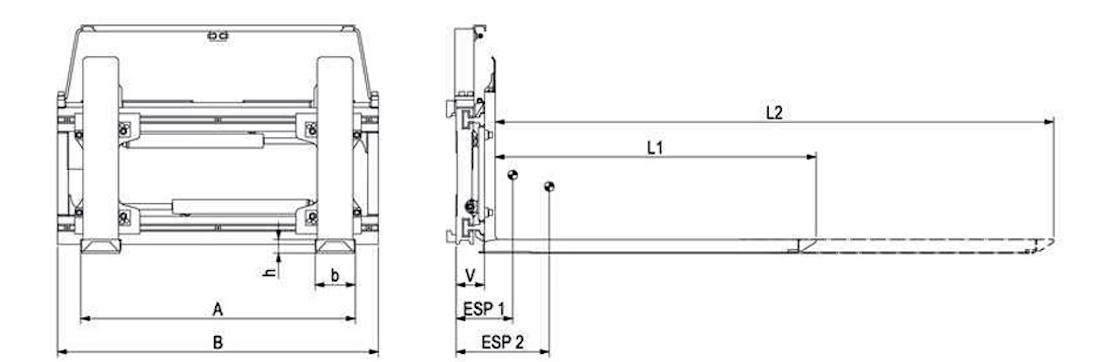 | typ | udźwig kg/mm LC 1 | udźwig kg/mm LC 2 | sugerowany udźwig kg/mm LC | ISO | B mm | A mm | długość baza wysuw L1/L2 mm | przekrój b x h mm | grzbiet wideł mm | V mm | ESP 1/2 mm | waga kg | cena Euro |